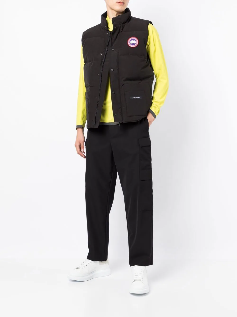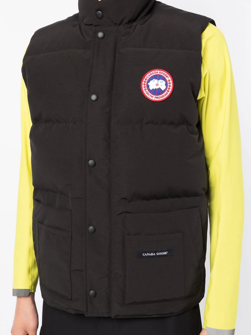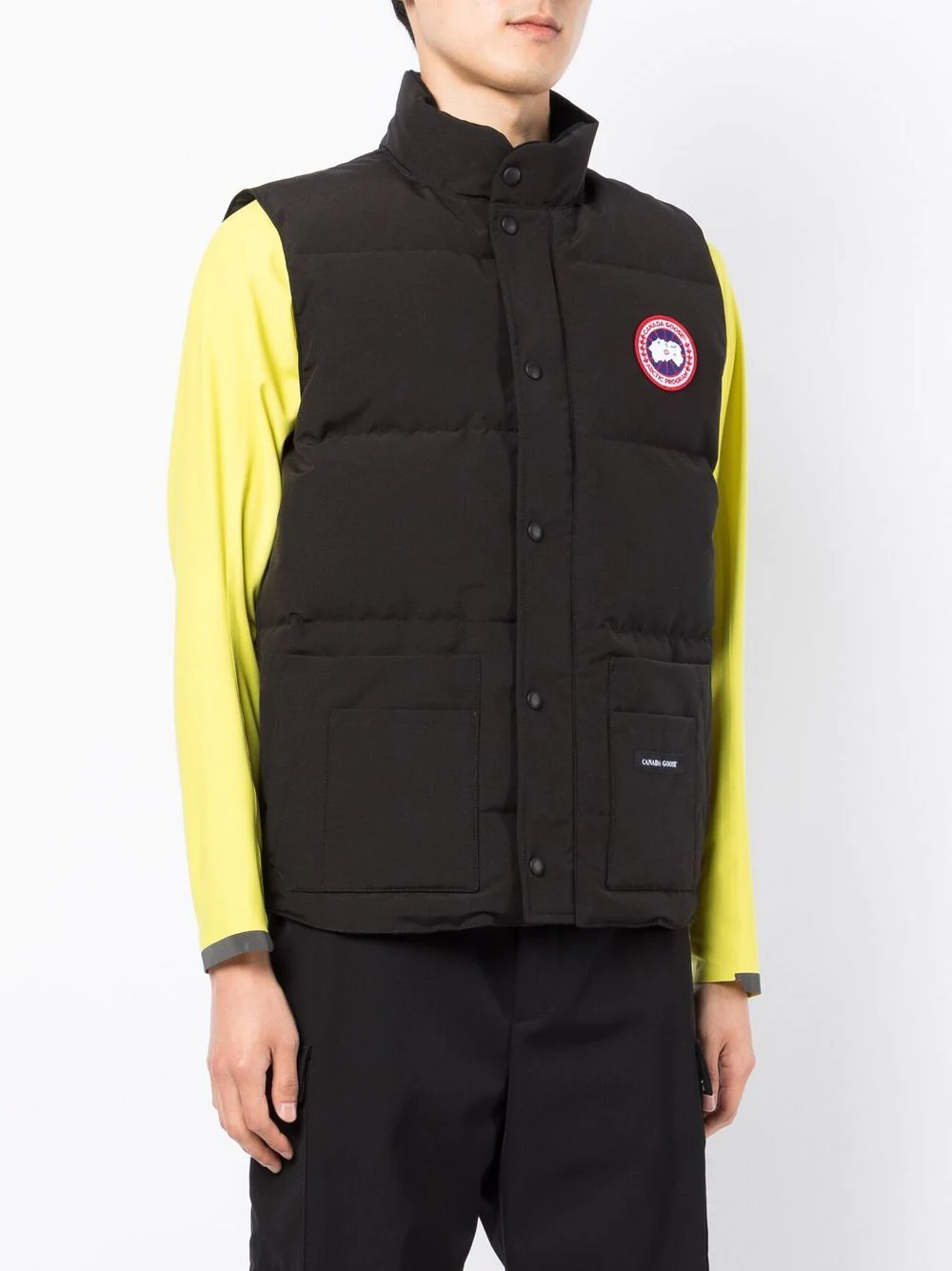 The Canada Goose Men Freestyle Padded Gilet Black is a sleek piece in the freestyle line and a trimmed layering essential. This features down padding, ripstop texture, a stand collar and chest logo patch with front two-way zip + button placket. Designed also for those who cross-shop utility without sleeves.