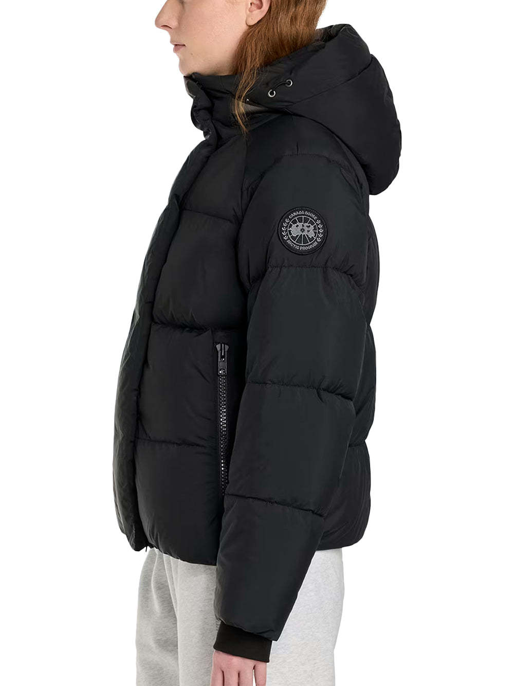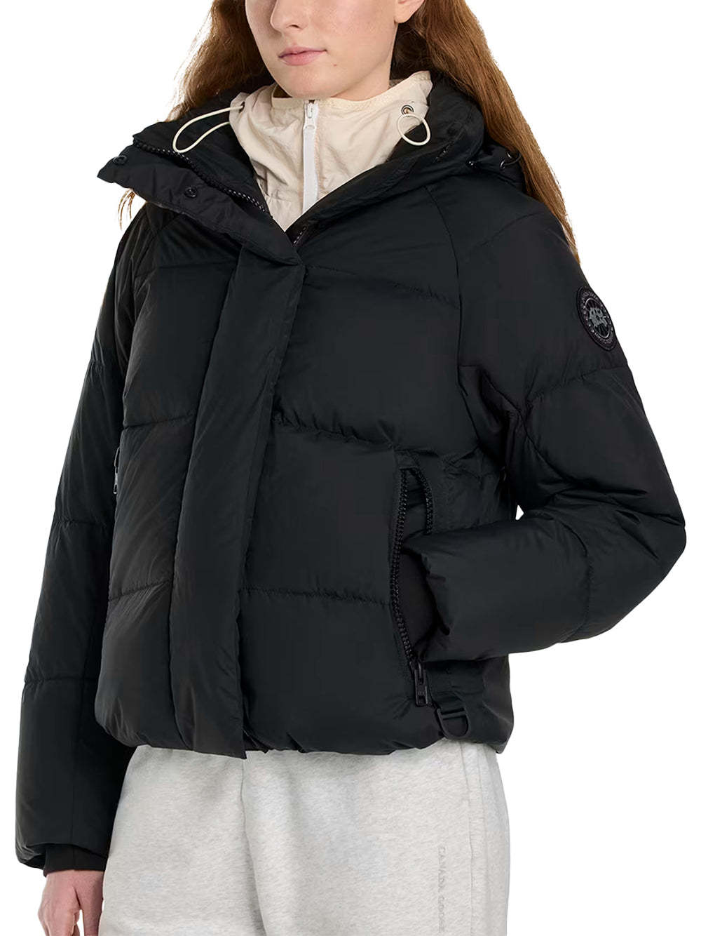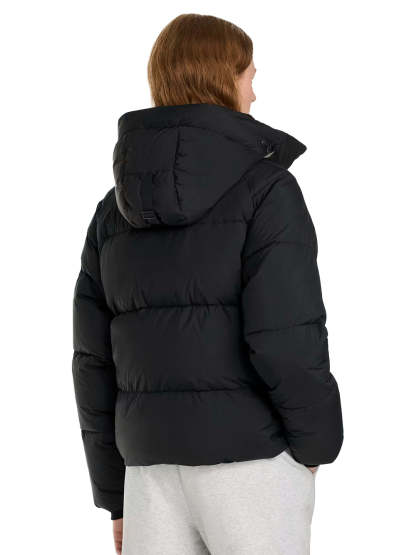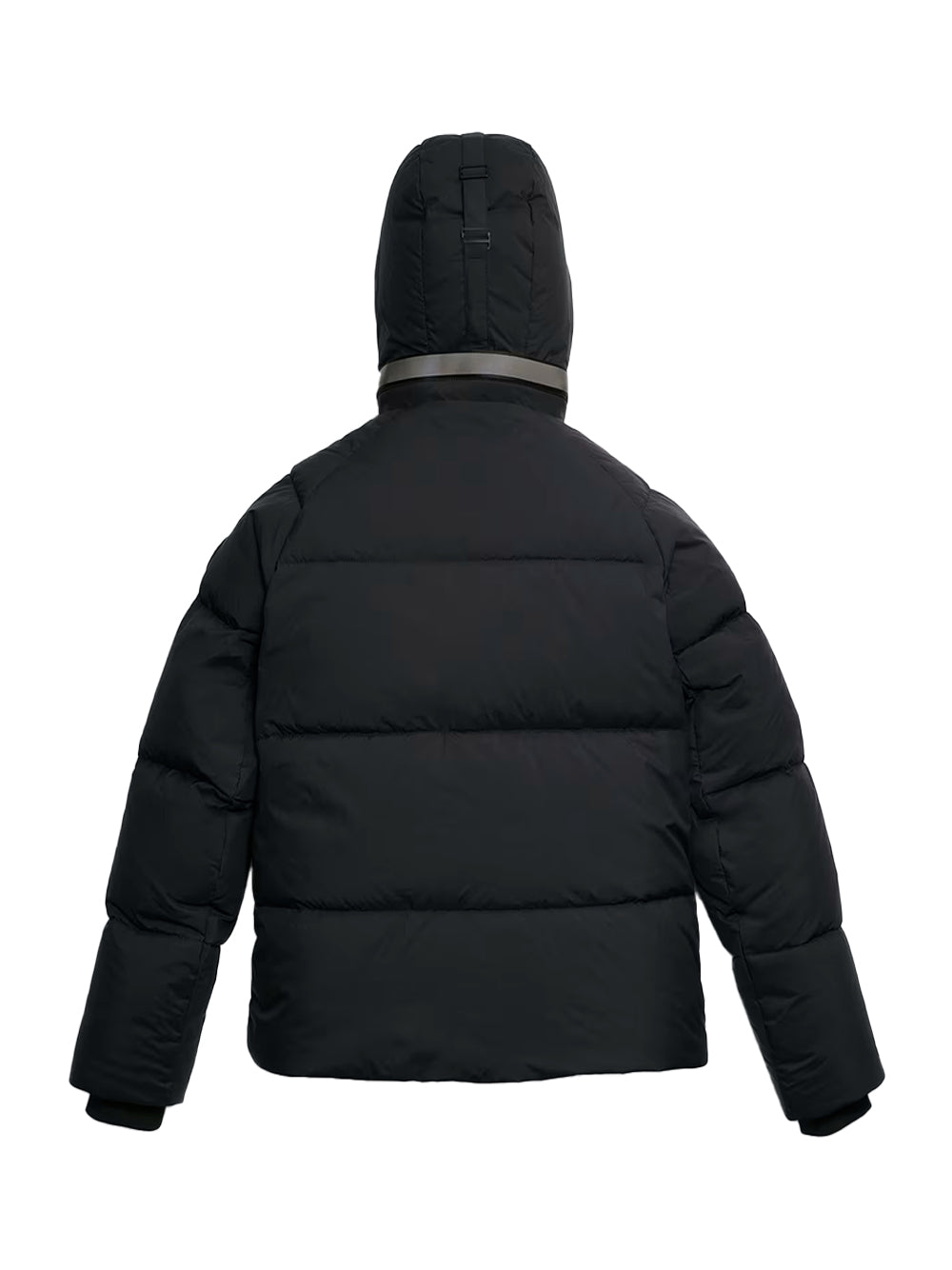 - Down-filled adjustable hood with drawcord
