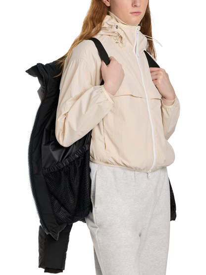 - Packable into interior left pocket. Converts into a cinchable bag with a carrying strap