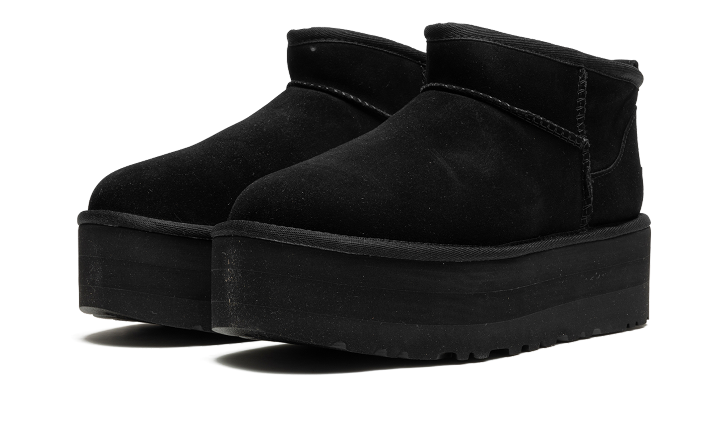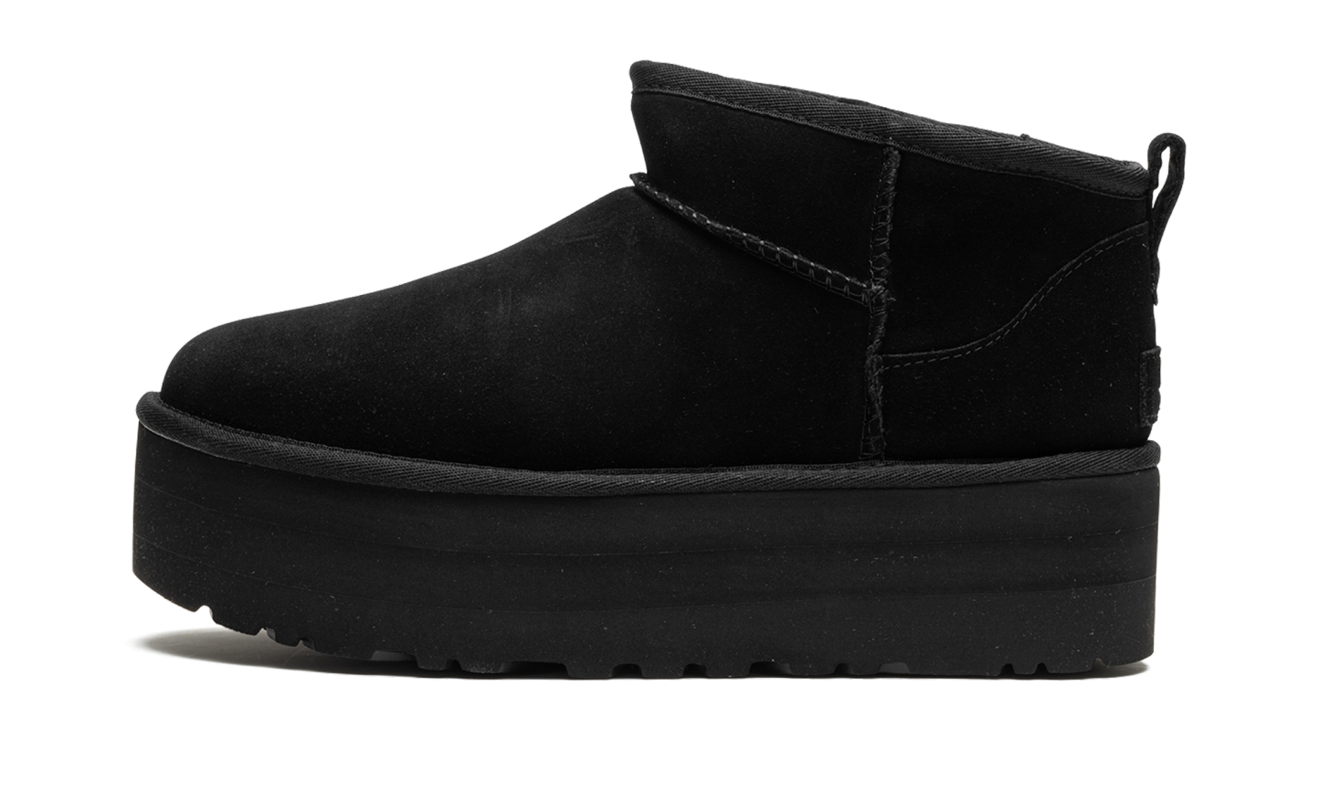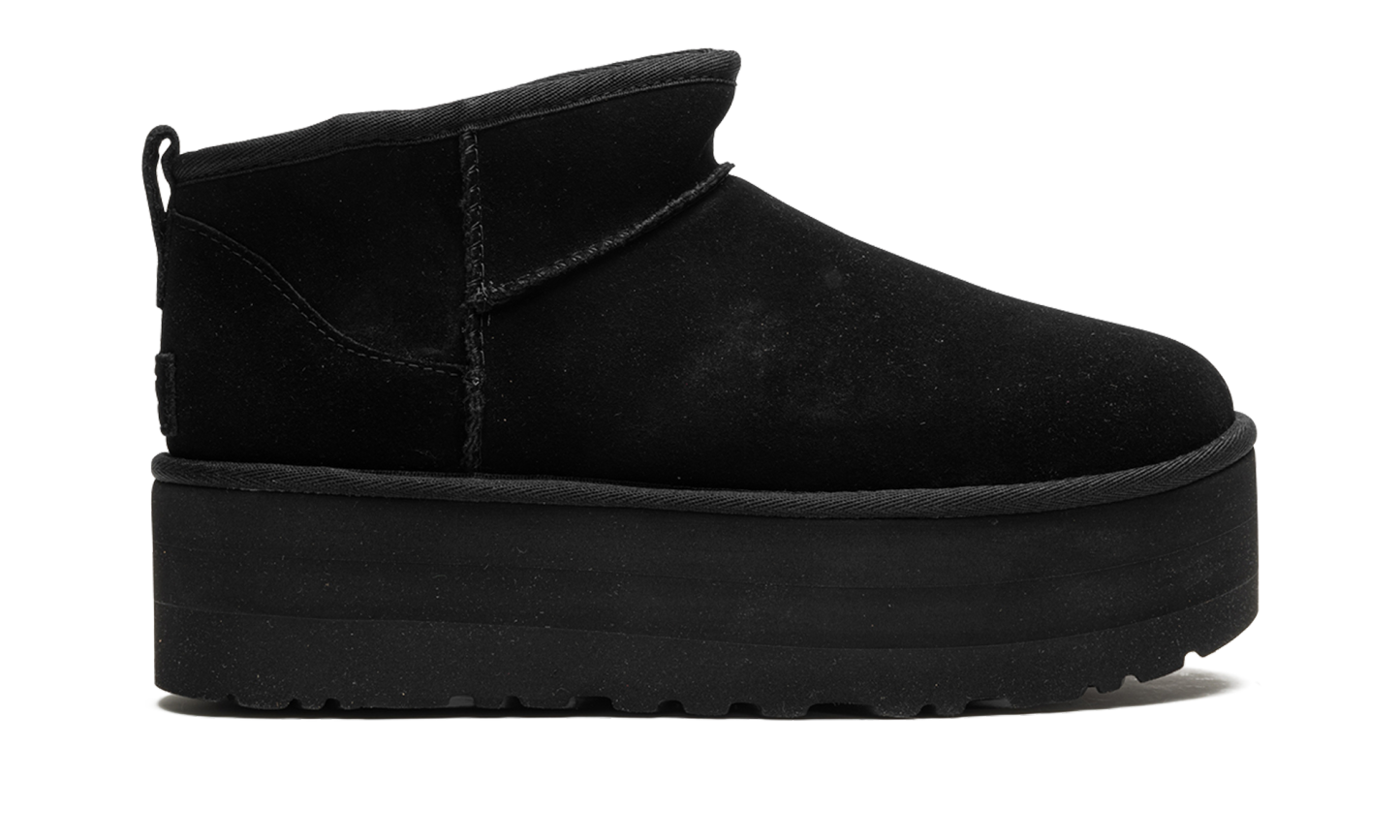 Step into luxurious height with the UGG Classic Ultra Mini Platform Wmns "Black". This women's boot features a fashionable platform sole and a sleek, black suede upper. The plush sheepskin lining ensures supreme warmth and comfort, making it a perfect choice for stylishly running errands or cozy indoor wear.