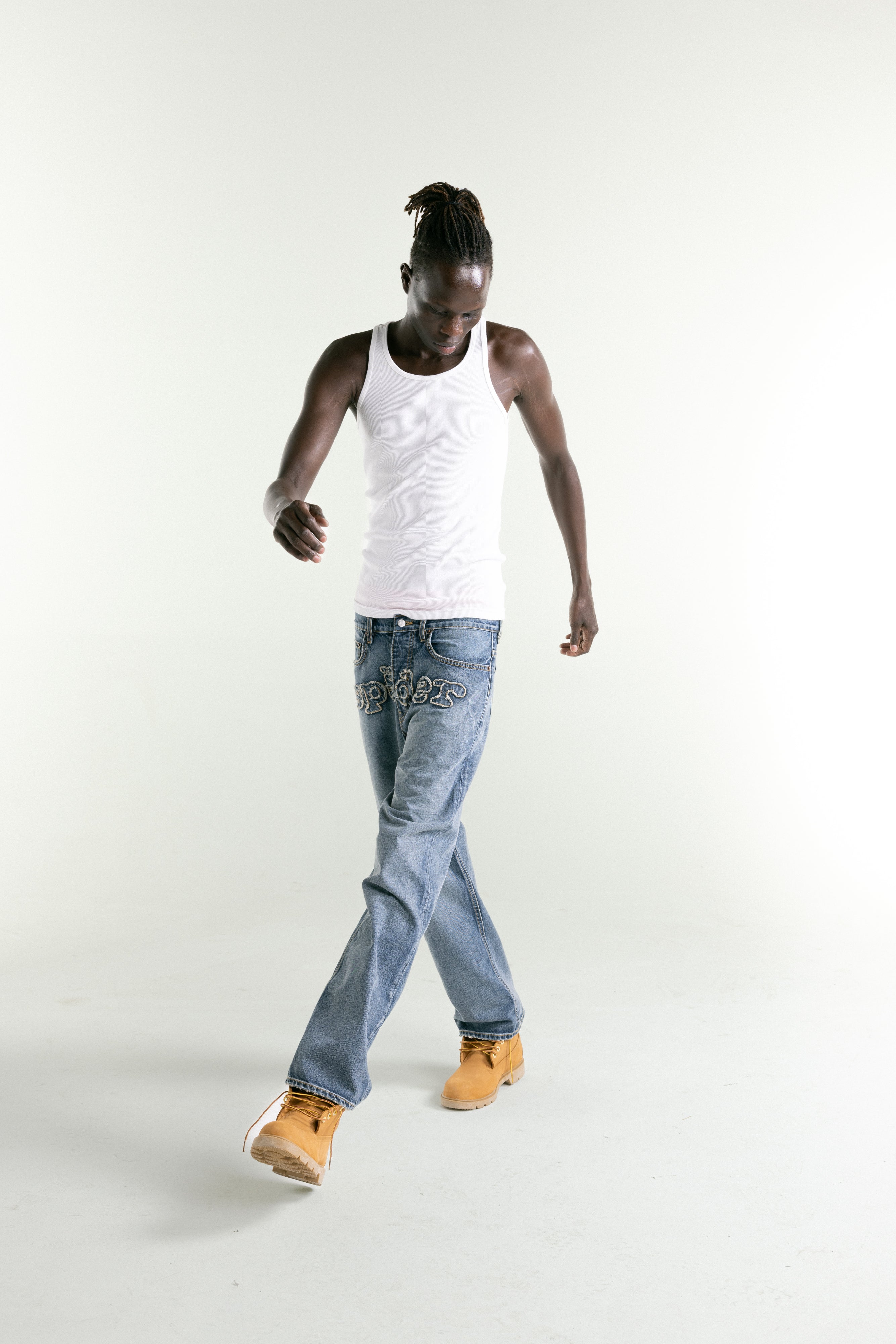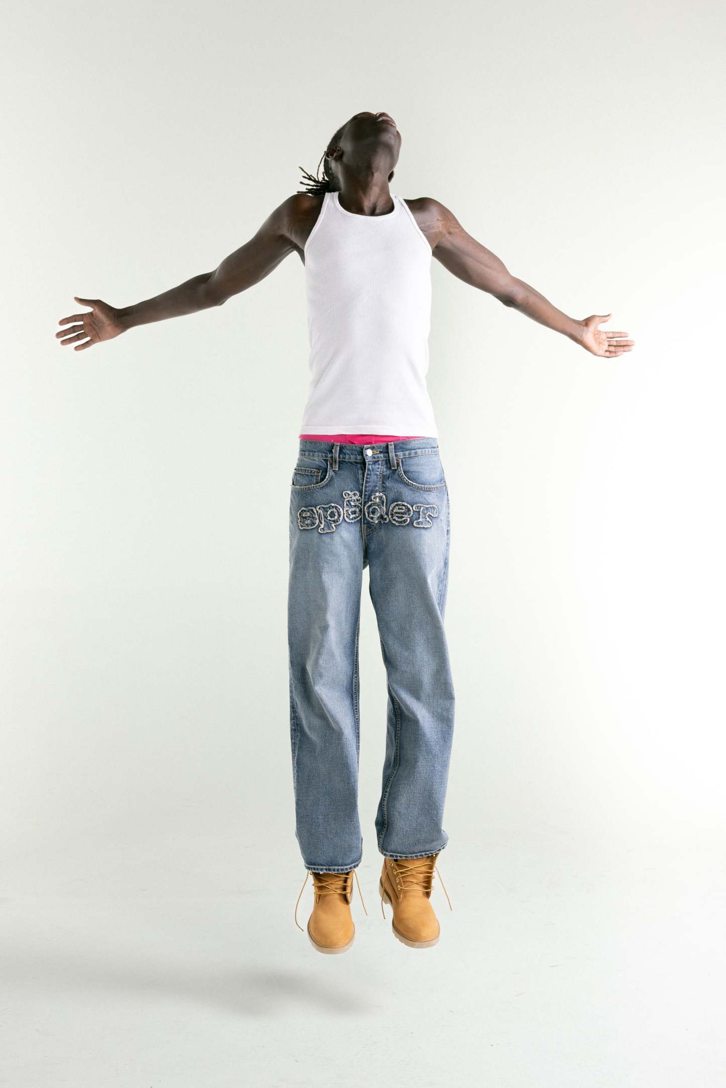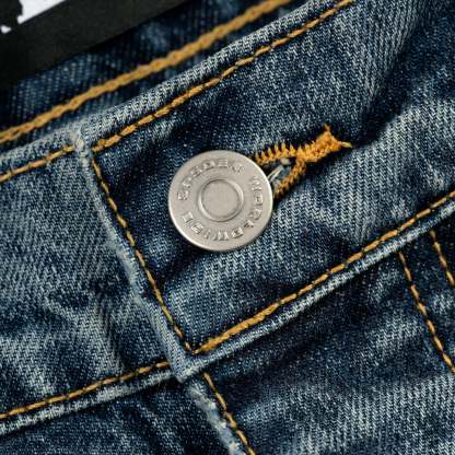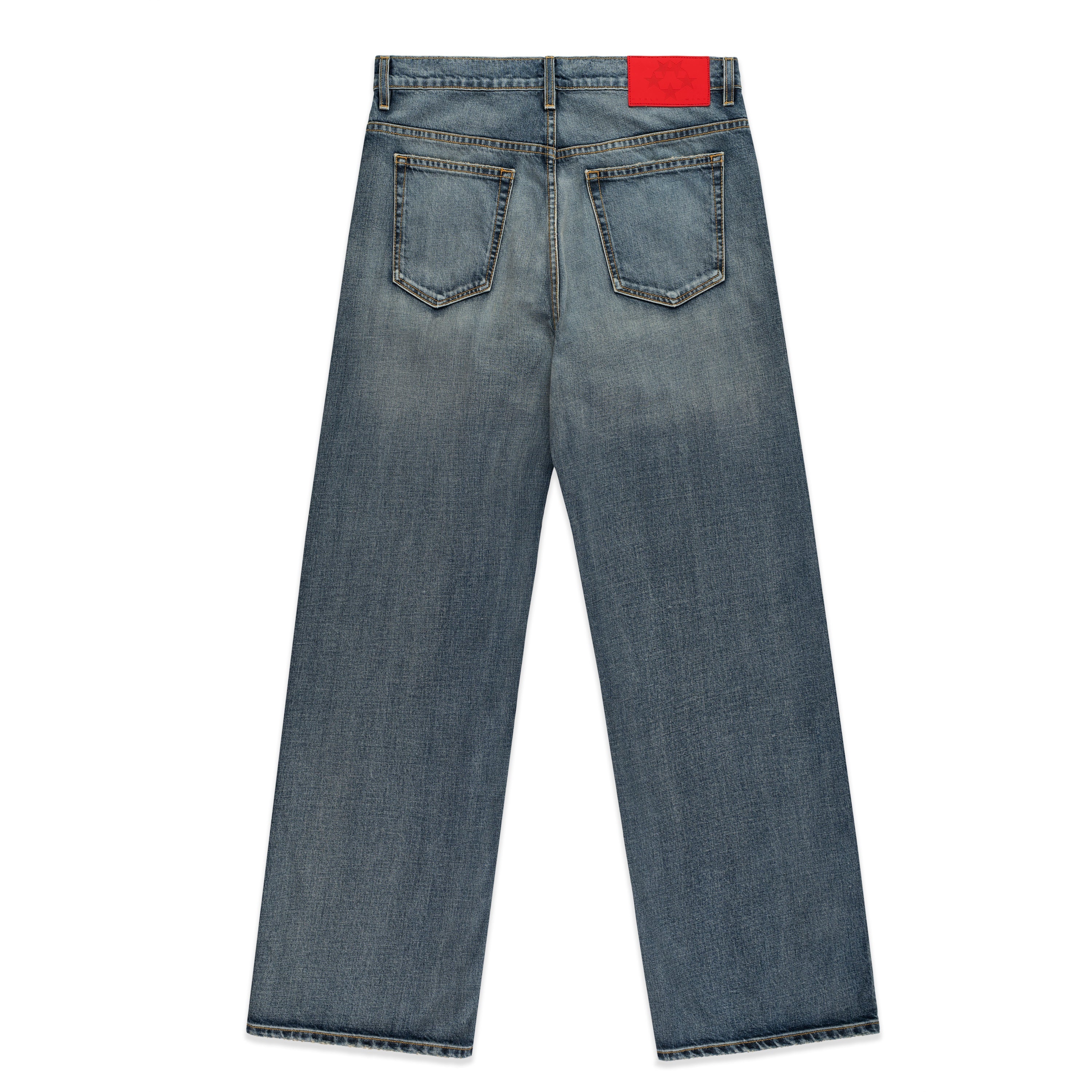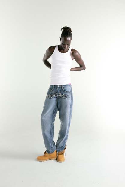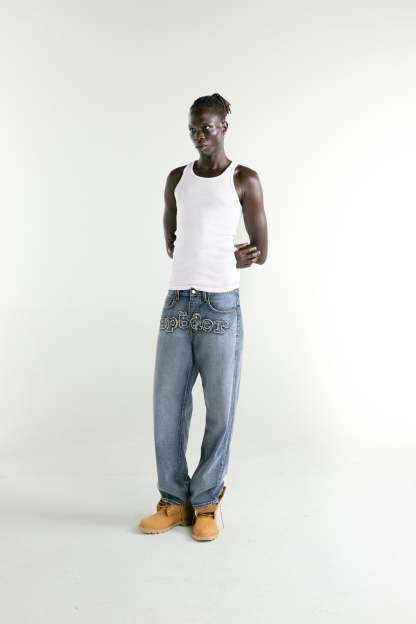 13oz denim pant. Faded wash. Signature frayed embroidered “SP5DER” logo across the front rise. Custom branded hardware. Branded leather back patch. Classic straight leg fit. Made in the USA.
